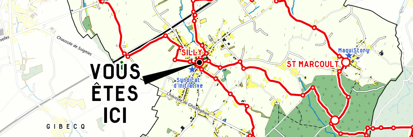 We have produced twelve printed maps for the commune of Silly to mark out a soft mobility network. These maps are displayed in the public space at the points where the soft mobility network intersects and loops between the villages in the municipality. Placed at each major junction, they serve as a reference point when walking. This map of the network has been produced in several versions, with specific information and a "You are here" location for each place. These maps, based on OpenStreetMap data, have been produced entirely in Qgis so that they can be easily updated, for example if there is a change in the soft mobility network. Beacons complete the maps at multiple points along the network, indicating directions and mileage.