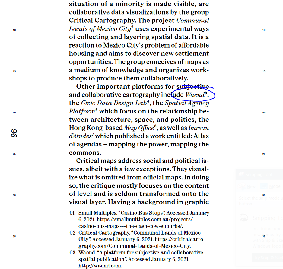 La plateforme Wænd a aussi été utilisée à diverses reprises pour réaliser des cartes qui visualisent l'information récoltées lors de processus participatifs notamment avec les EGEB et l'IRSNB lors d'ateliers rassemblant des citoyens autour de la question de l'eau en milieu urbain, le CIVA-CERAA-Bruxelles Environnement-collectif Ipé-asbl Tournesol lors d'une balade exploratoire sur le territoire du canal qui a donné lieu à la carte La ville comme écosystème? , avec BRI-co pour le projet Marollywood , et la rénovation de l'immeuble de logements à Andromède .